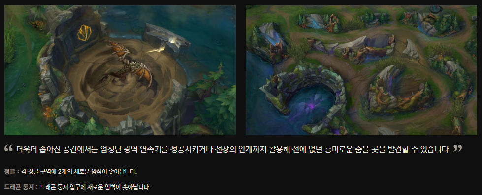 가장 큰 변화는 소환사의 협곡 자체의 변화인데, 게임의 2번 째 원소 드래곤이 처치당하면 소환사의 협곡 지형 자체가 특별한 지형을 가진 원소의 협곡 4개 중 하나로 영구 변경된다고 한다. 이러한 변경은 드래곤 4마리 처치 시 영혼을 획득하게 된 후, 각 드래곤의 영혼 별로 추가적인 효과를 제공하는 것과 연계되어 게임에 큰 영향을 주게 될 것 같다.