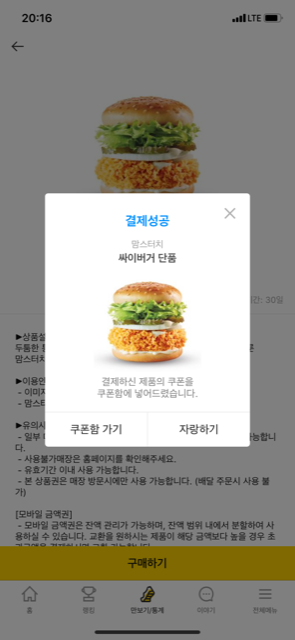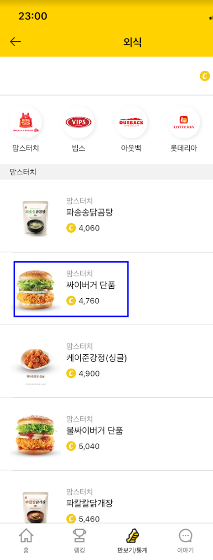 얼마전 다시 아이폰에서 상점에 들어가니, 맘스터치 싸이버거의 가격이 안드로이드와 동일하게 바뀌어 있었다. 아래를 보면 이전과는 다르게, 4760코인으로 변동된 것이다. 정책의 변경인지 아니면 랜덤으로 상품의 가격이 바뀌는지는 모르겠다. 다음에 이정도면 2달에 한번 정도는 무료로 싸이버거를 먹을 수 있지 않을까?..