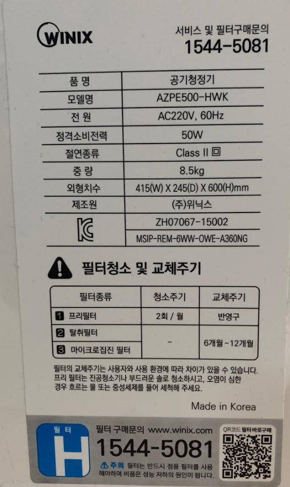 공기청정기는 곧 필터의 성능이라고 할 수 있는데, 위닉스 제로플러스 모델(AZPE500-HWK)의 경우, 아래의 H필터를 사용하면 된다. 정품은 대략 5~6만원 사이인데, 가끔 이벤트를 통해 4만원 후반대로 구입할 수 있다.