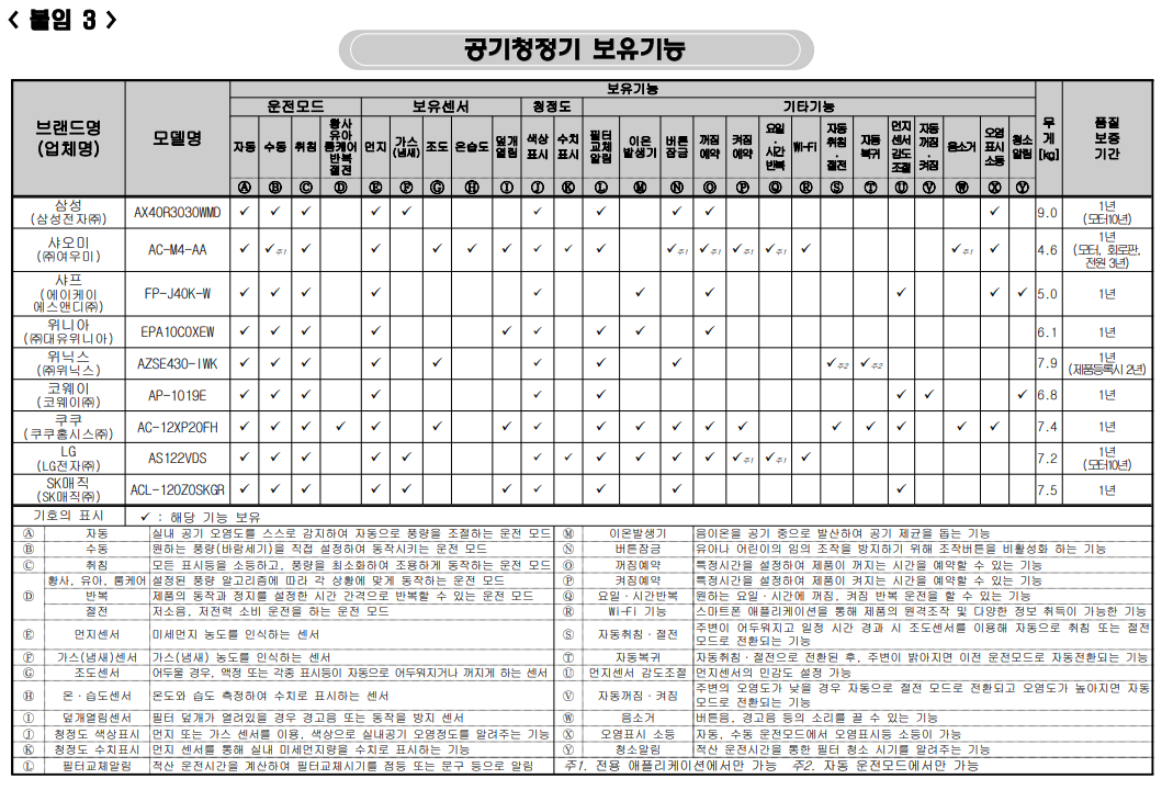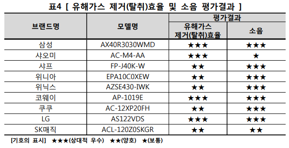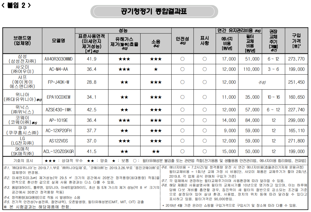 * 삼성전자㈜(AX40R3030WMD), ㈜여우미(AC-M4-AA), 에이케이에스앤디㈜(FP-J40K-W), ㈜대유위니아(EPA10C0XEW), ㈜위닉스(AZSE430-IWK), 코웨이㈜(AP-1019E), 쿠쿠홈시스㈜(AC-12XP20FH), LG전자㈜(AS122VDS), SK매직㈜(ACL-120Z0SKGR)인데, 시험 결과, 유해가스 제거(탈취)효율, 소음 등에서 제품 간 차이가 있었고, 필터교체 비용은 제품 간 최대 3.1배, 연간 전기요금은 최대 1.9배 차이를 보였다.감전·누전, 필터의 유해성분* 등 안전성에서는 전 제품 이상이 없었다.