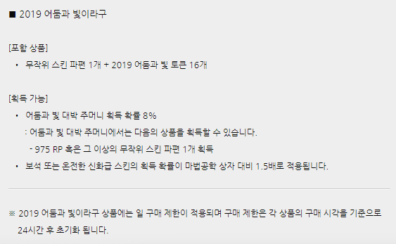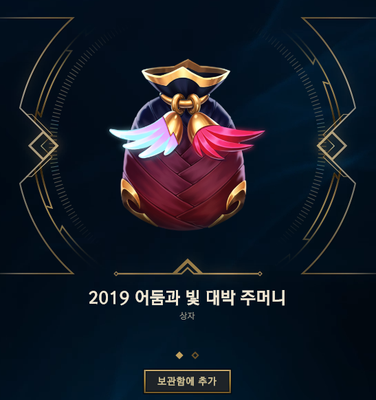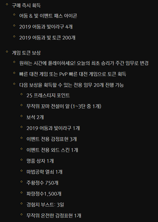 2019 롤 어둠과 빛 이벤트가 2020년 1월 14일까지 진행된다. 어둠과 빛 패스를 구매하라고는 하는데, 일단 구매를 안해도 임무 완수를 통해 약간의 어둠과 빛 토큰을 모을 수는 있다.