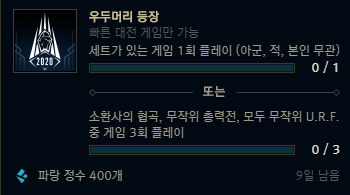 3. 2020 시즌 시작을 기념하는 이벤트가 열리는데, 임무는 01/11 06:00 부터 01/25 16:59 까지 진행할 수 있고, 일부 임무의 경우 정해진 일정에 따라 순차적으로 활성화될 수 있다. 아래와 같은 임무들이 있는데, 파랑 정수는 딱히 관심 없고, 칼바람으로 킬/어시 100회 달성해서 마법공학 상자나 받아야 겠다.
