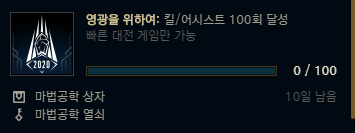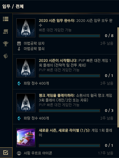 자고 일어났더니 2020 시즌 임무가 바뀌어 있다. 킬어시스트 100회 달성이, 시즌 임무 모두 완수로 바뀌어 있었고, 그 외 자잘한 사항이 변경되었다. 랭겜하기 싫은데, 공짜 마법공학 상자를 위해 랭겜 3판 해서 조건을 맞춰야 겠지...