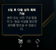 2. 그리고 새로운 시즌이 시작되더라도 대기중인 상자의 갯수에는 영향을 주지 않는다. 따라서 1번에서 말한 것처럼 게임 플레이 후 S를 받더라도 대기중인 상자가 없으면 마법공학 상자를 받을 수 없다.