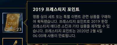 현재 2019 프레스트지 포인트1개를 주황정수 30개로 바꿔주고 있다. 2019 프레스티지 포인트는 2020년 2월4일에 만료되므로, 50개부터 구할 수 있는 대박주머니를 얻지 못할바에는 주황정수나 열쇠로 바꾸도록하자. 나도 사용하고 남는 포인트가 있어서 주황정수랑 열쇠로 바꿨다.