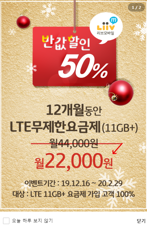 1. 아래의 사진이 이번에 진행하는 리브 모바일 반값할인 이벤트이다. 리브 모바일의 경우, PC버전 및 어플 없이 모바일 버전으로만 운영되기 때문에, PC에서 진행하면 사이즈가 안맞아 불편할 수 있으니, 모바일로 진행하는 것이 좋다.