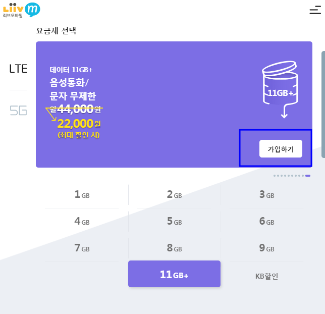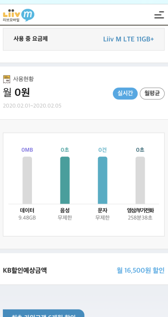 11. 모바일 사이트에 다시 접속하니 아래와 같은 사용현황을 확인 할 수 있었고, 아래에 설명된 것처럼, LTE 11GB+로 요금제를 사용하는 경우는, 월 예상요금과는 상관없이 1년간 22000원이 적용된다고 한다.