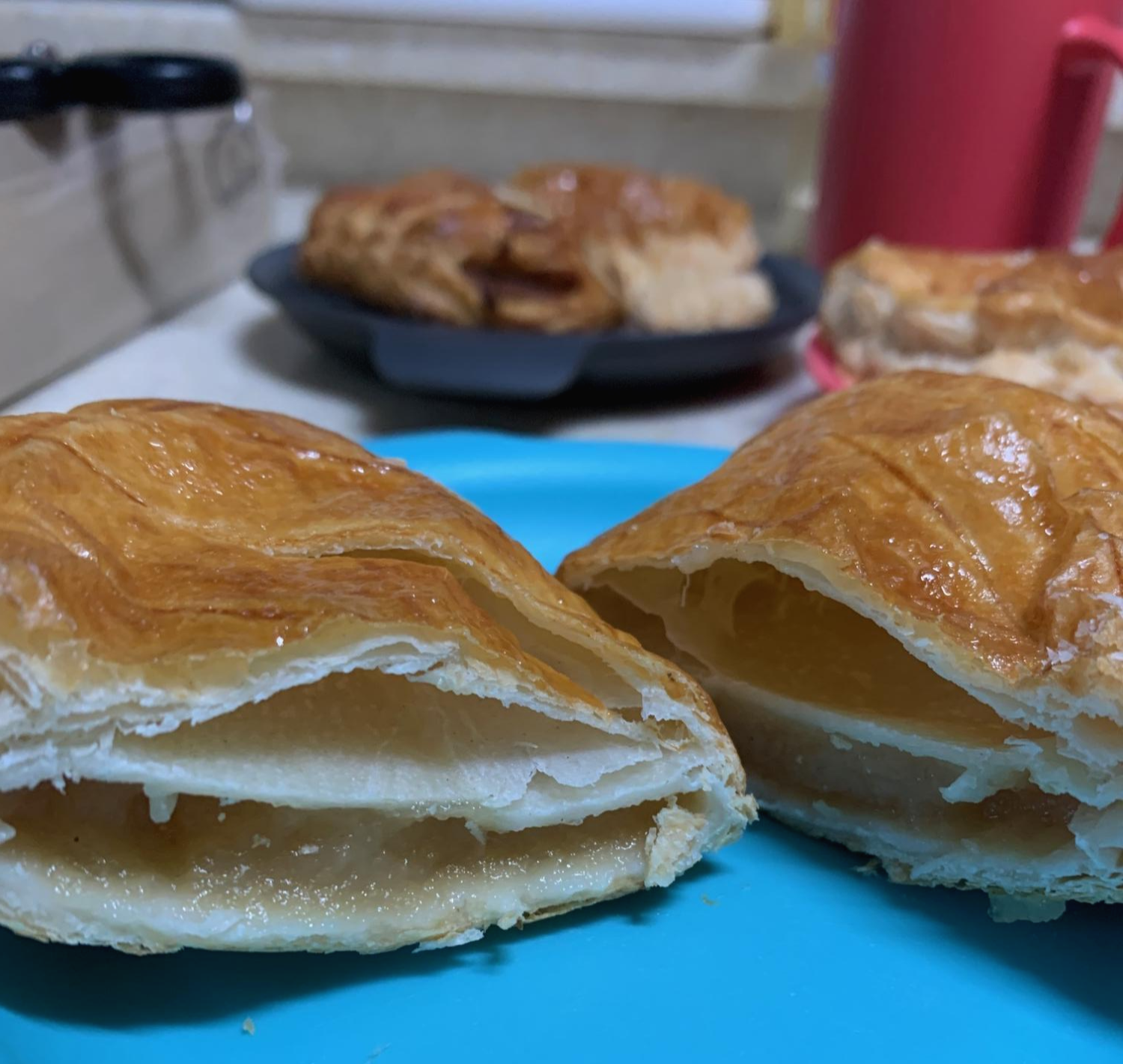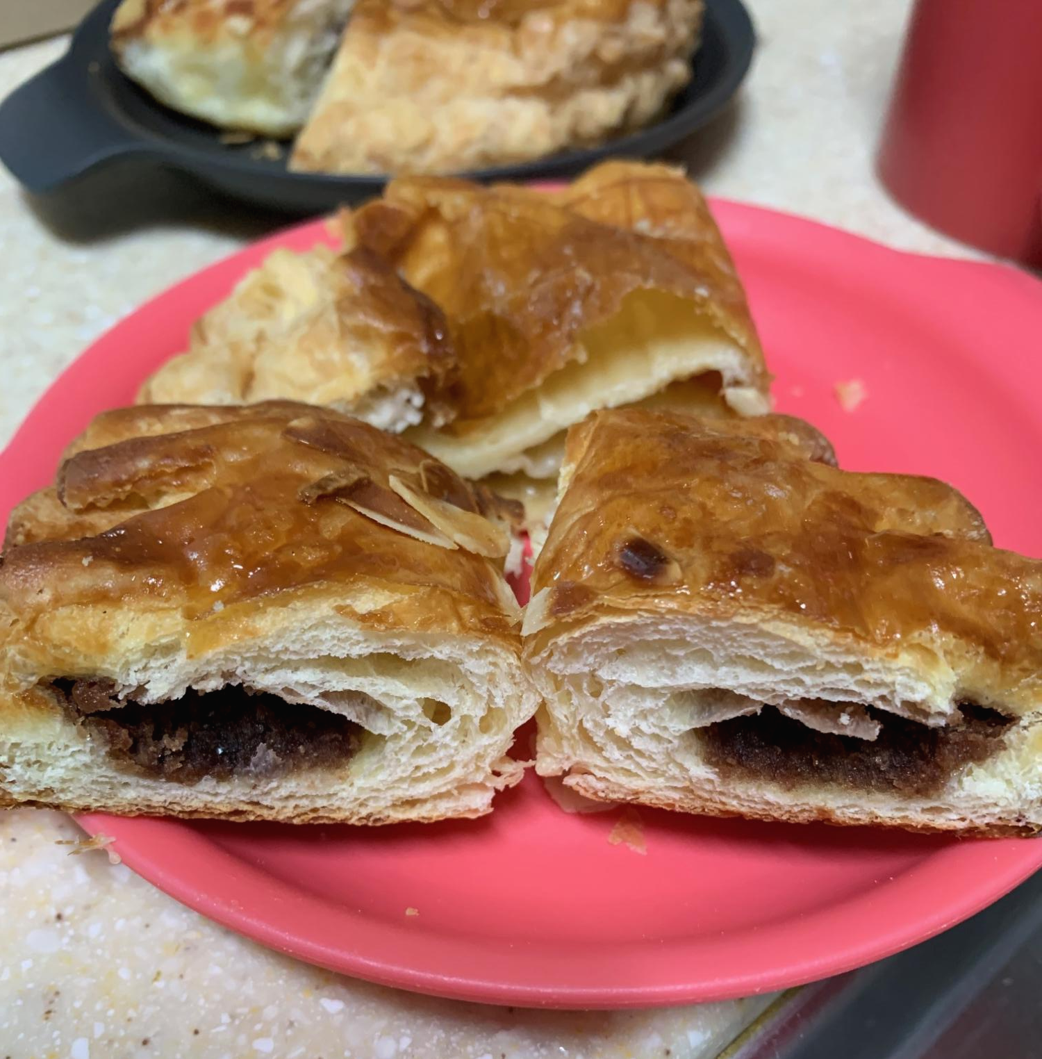 아래는 단팥파이의 단면이다. 사실 애플파이가 먹고 싶어서 구입한건데, 프렌치파이보다 단팥파이가 더 맛있었다. 속에 들은 단팥의 비율이 보통 먹는 단팥빵에 비해 현저히 적었음에도 불구하고 파이라는 식감 자체 때문에 괜찮게 느껴졌다.