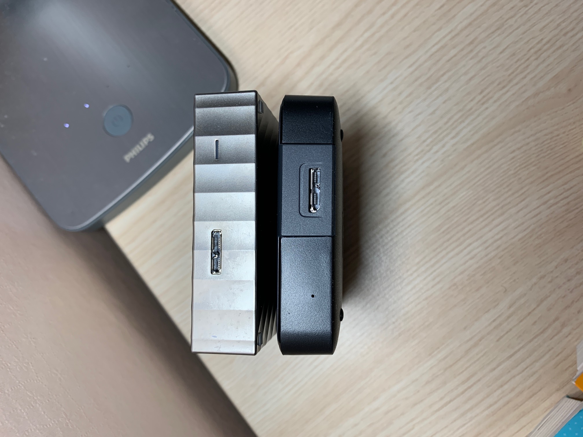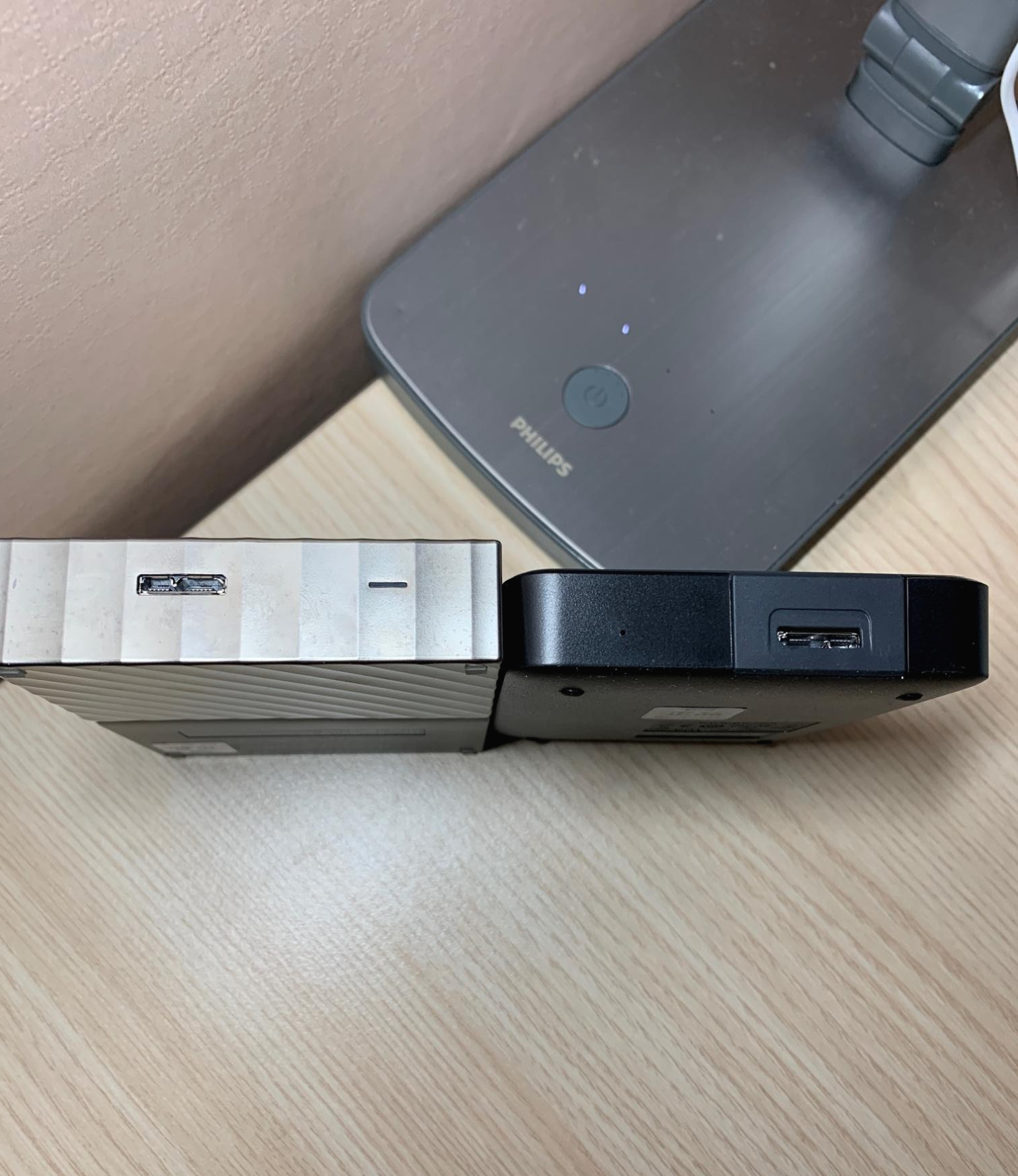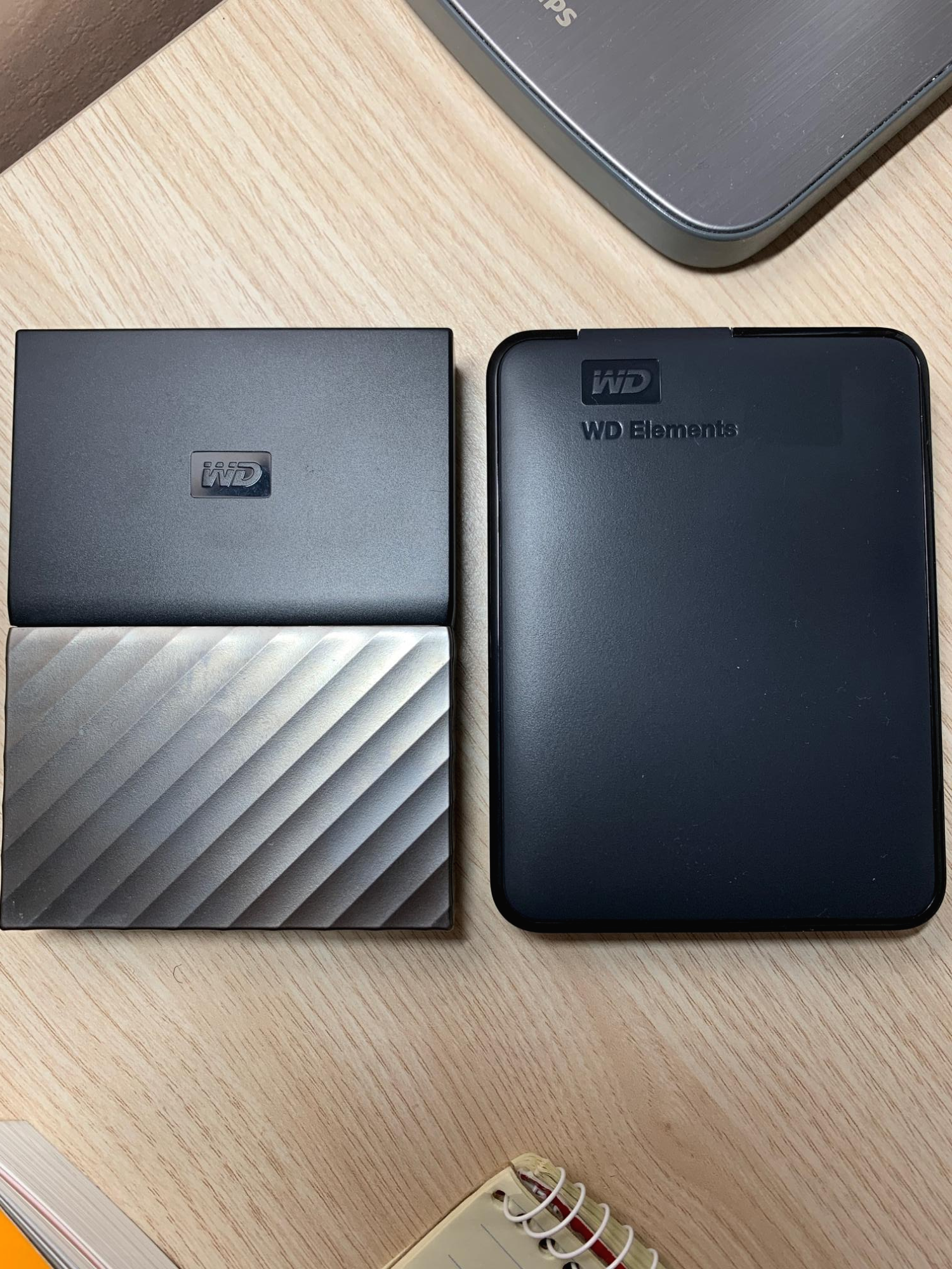 아래는 WD my passport 1tb와 element 3tb의 외관에 대한 비교 사진이다. 오히려 3tb인 element가 더 작은 것을 확인할 수 있다.(디자인 차이로 인해 무게도 비슷하다. 원래 용량이 많을 수록 더 무거워진다)