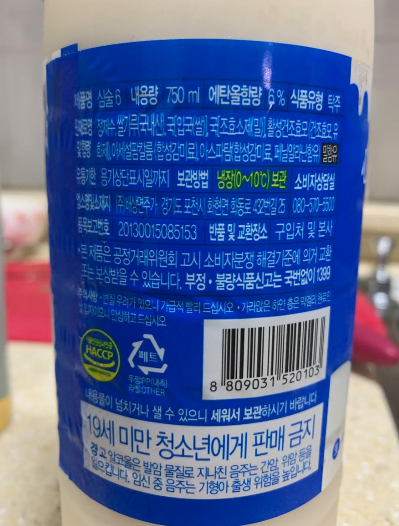 원재료명 : 정제수, 쌀가루(국내산), 국(조효소제(밀), 활성건조효모, 아세설팜칼륨(합성감미료), 아스파탐(합성감미료,페닐알라닌함유)