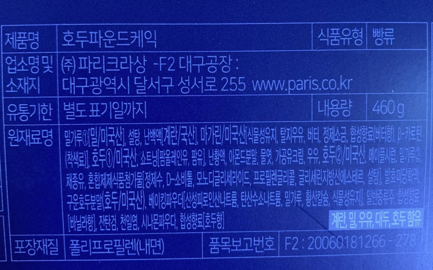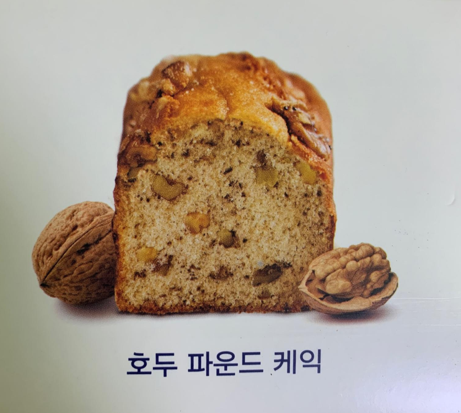 아래에는 호두 파운드 케익의 패키지 사진이다. 정말 먹음직스럽다. 이런 비주얼로 제품이 들어 있으면 욕할 수가 없지. (다만 패키지 측면을 보면, 사진과 실제 제품에는 차이가 있다고 명시되어 있다. 파리바게뜨는 거짓말을 하지 않았다.)