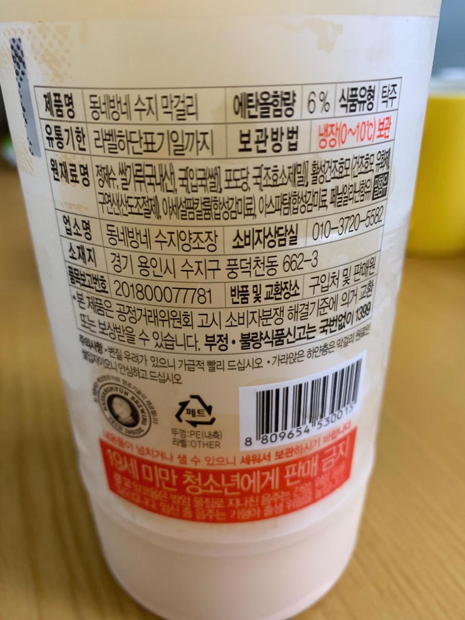 에탄올함량은 6도로, 원재료명을 보면 상당히 많은 재료가 사용됐음을 알 수 있다. 정제수, 쌀가루(국내산), 국, 포도당, 국, 활성건조효모, 구연산, 아세설팜칼룸, 아스파탐이 포함되어 있다. 쌀 외에 엄청나게 많은 첨가물이 들어 있다는 것이다. 보통 이정도 들어가면, 단맛이 강하기 마련인데, 좋게 말하면 밸런스가 잘 잡혀 있는 맛이고, 나쁘게 표현하자면 밸런스의 강도가 매우 작은 오각형이라는 것이다. 좋은 표현의 밸런스라하면, 5점 만점으로, 단맛, 탄산, 끝맛 등등을 5점으로 커다란 오각형을 보여줄 수 있다면, 수지 막걸리는 작은 오각형의 맛을 보여주고 있다고 개인적으로 생각한다. 그러나 안주와의 조합이 수지 막걸리의 맛에 영향을 미치는 것을 확인할 수 있었는데, 심심한 안주류 보다는 맵고 짠 음식들과 먹을 때 수지 막걸리의 맛이 더 좋게 평가될 것이라 본다.