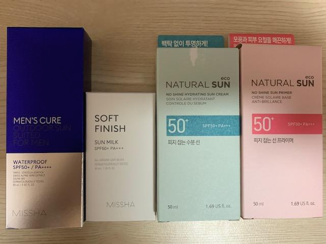 이번에 선크림 5개를 동시에 구매했다. 미샤 제품 2개, 페이스샵 제품 2개, 이니스프리 1개. 오늘은 그 중에서 미샤 아웃도어 선 수티드와 페이스샵의 내추럴 선 에코 피지 잡는 수분 선에 대한 후기이다.