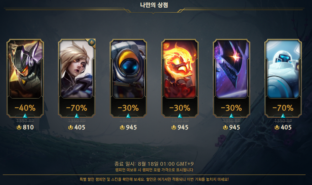 모두 서사급 스킨이 나왔는데, 블리치크랭크의 할인율이 대박이다..프로젝트 레오나, iG 피오라, 우주비행사 노틸러스, 지옥의 아무무, 암흑의 별 카직스, i블리치크랭크가 포함되어 있다.