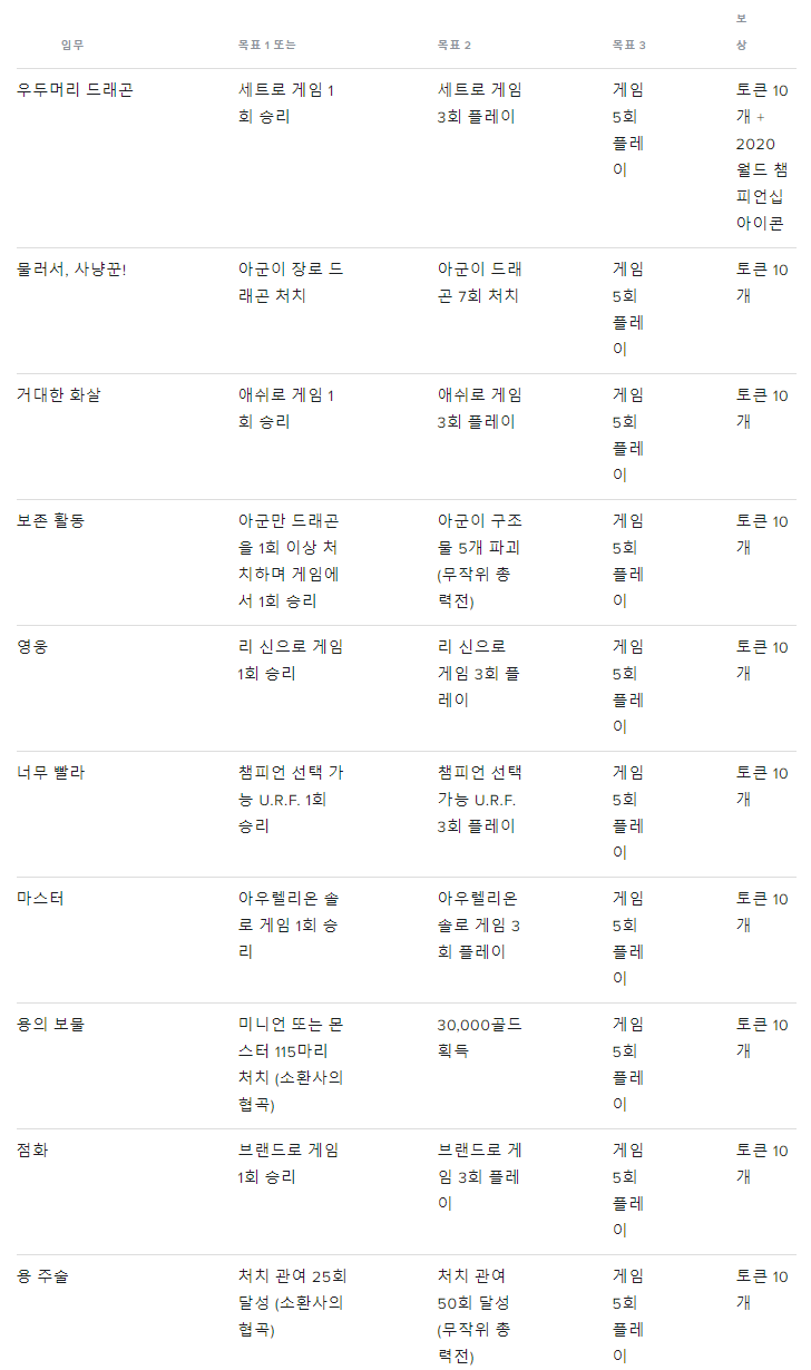 2020년 월드 챔피언십 임무가 활성화 되었다. 이번 임무는 2020년 11월 10일 오후 4시까지 진행가능하며, 11월 25일 오전6시까지 획득한 토큰을 사용할 수 있다.
