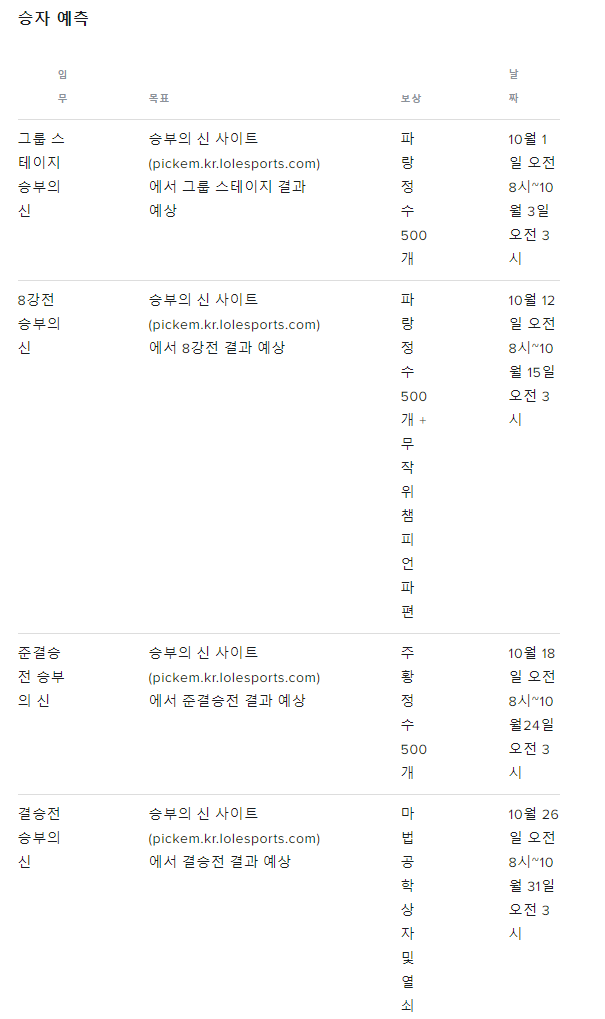 승부의 신 임무라고 챔피언십 결과를 예상하는 이벤트가 계속 활성화되어 있는데, 처음에는 보상이 적지만, 준결승 결과부터는 주황정수 및 마법공학 상자를 보상해주므로, 시기에 맞춰서 반드시 참여할 수 있도록 하자.
