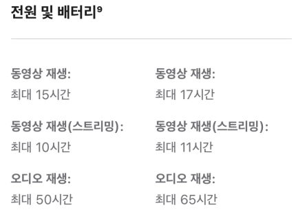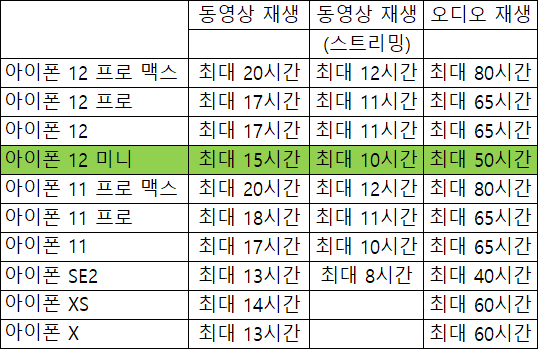 실제 재생 시간 또한 확인해 봐야겠지만, 스펙만 봐서는 아이폰 12와도 큰 차이가 없고, 아이폰 xs와도 큰 차이가 없다.