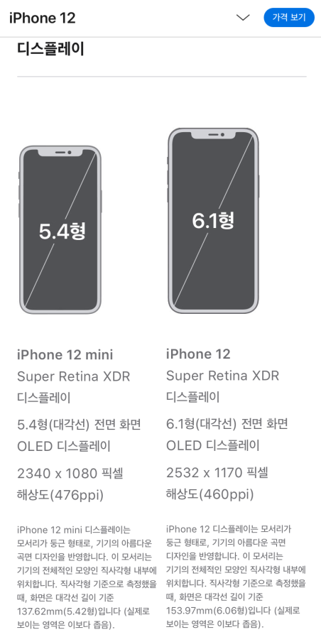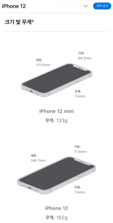 대세는 6인치 이상의 대형폰이지만, 휴대성을 극대화한 고성능 스펙의 휴대폰을 바라는 사람들도 여전히 존재한다. 이번에 애플은 아이폰 12와 동일한 스팩을 가지면서(모두 5G 및 LTE를 기본 지원하며 방수 등급도 IP68로 동일하고 전면카메라 역시 모두 1200만화소), 크기와 무게만(배터리는 당연히 줄어듬) 줄여 놓은 아이폰 12 미니를 출시했다. 아래는 아이폰 12 미니와 아이폰 12의 차이점만을 캡쳐했다. 나머지 스펙은 아이폰 12 미니와 아이폰 12가 동일하다. 아이폰 12 프로 모델하고도 디스플레이와 기본 성능은 동일하며, 프로 모델이 더 좋은건 램이 6기가(아이폰 12와 아이폰 12 미니는 4기가라는 소문이 있다)라는 점과 스뎅 마감, 더 좋은 카메라(망원 존재하지만 기본 카메라 2개는 아이폰 12 미니와 차이가 없다), 좀 더 밝아진 최대 밝기인데, 오히려 무게가 증가했기 때문에 나로서는 큰 매력이 없다.