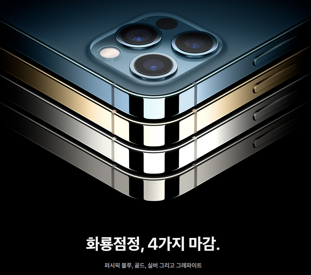 아이폰12 프로 모델은 아래와 같이 퍼시픽 블루, 골드, 실버 그리고 그래파이트로 출시 된다.