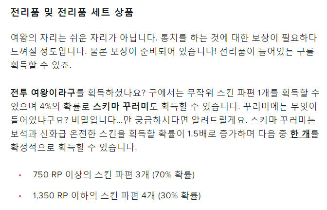 이번 전투여왕이라구는 기본적으로 스킨 파편 1개를 획득할 수 있으며, 4%의 확률로 스키마 꾸러미가 나온다고 한다.