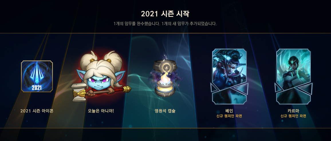 작년에 2020 시즌 시작할때 이런 임무가 있었나 싶다. 뭔가 추가 임무가 싶어, 빠르게 3번 완료했는데 이걸로 끝인가보다...그래도 영원석캡슐 까서 주황색 정수 한 400개 바꿔 먹어서 생각보다 꿀 이벤트인듯 하다. 베인이랑 카르마는 왜 준거지? 흠..