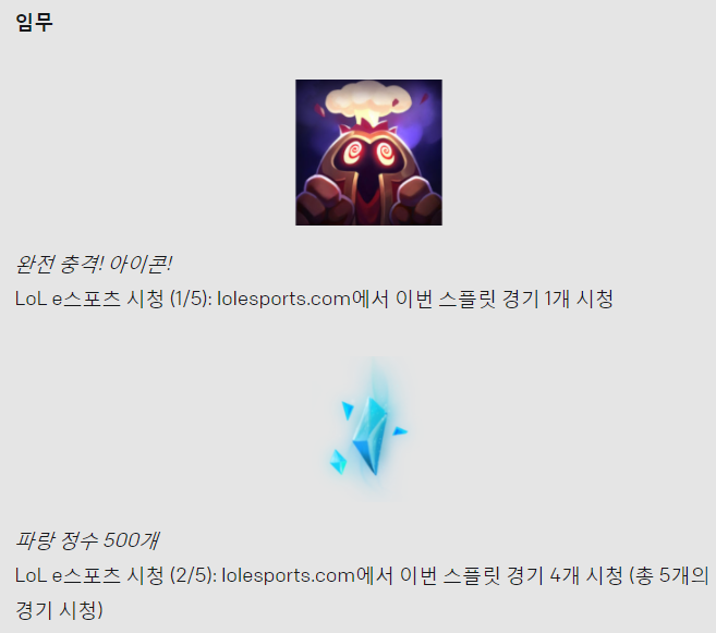 롤 스포츠에 로그인한 상태로 프로 경기의 생중계 또는 VOD를 시청하면 파랑 정수, 마법공학 상자 + 열쇠등을 준다고 한다. 다만 한국에서 접속할 경우에는 트위치로 봐야만 한다.