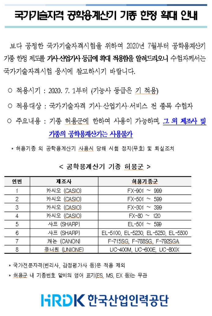 2020년 7월부터 공학용계산기의 기종이 제한되었다. 따라서 아래에 허용기종군을 제외하고는 사용할 수가 없다. 나 역시 기존에 사용하던 좋은 공학용 계산기를 중고로 팔고, 카시오 FX-570EX를 구입했다. 인터페이스는 비슷하나 아무래도 저가형이므로 기존에 사용한던 것만큼 속도가 나질 않지만 익숙해지려고 열심히 노력중에 있다.