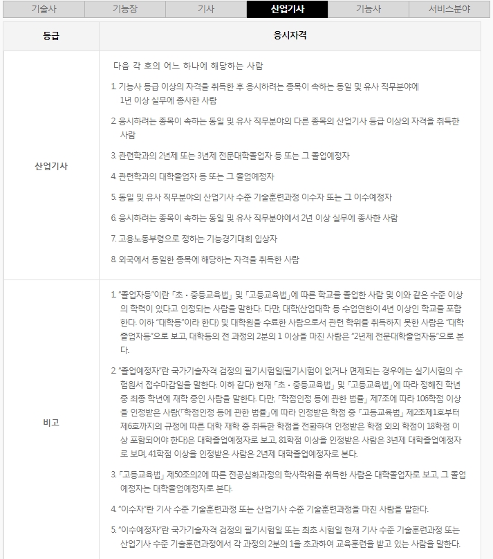 기사 및 산업기사의 필기 시험에는 응시 자격이 필요하며 다음의 항목 중에 하나에 해당해야 한다.