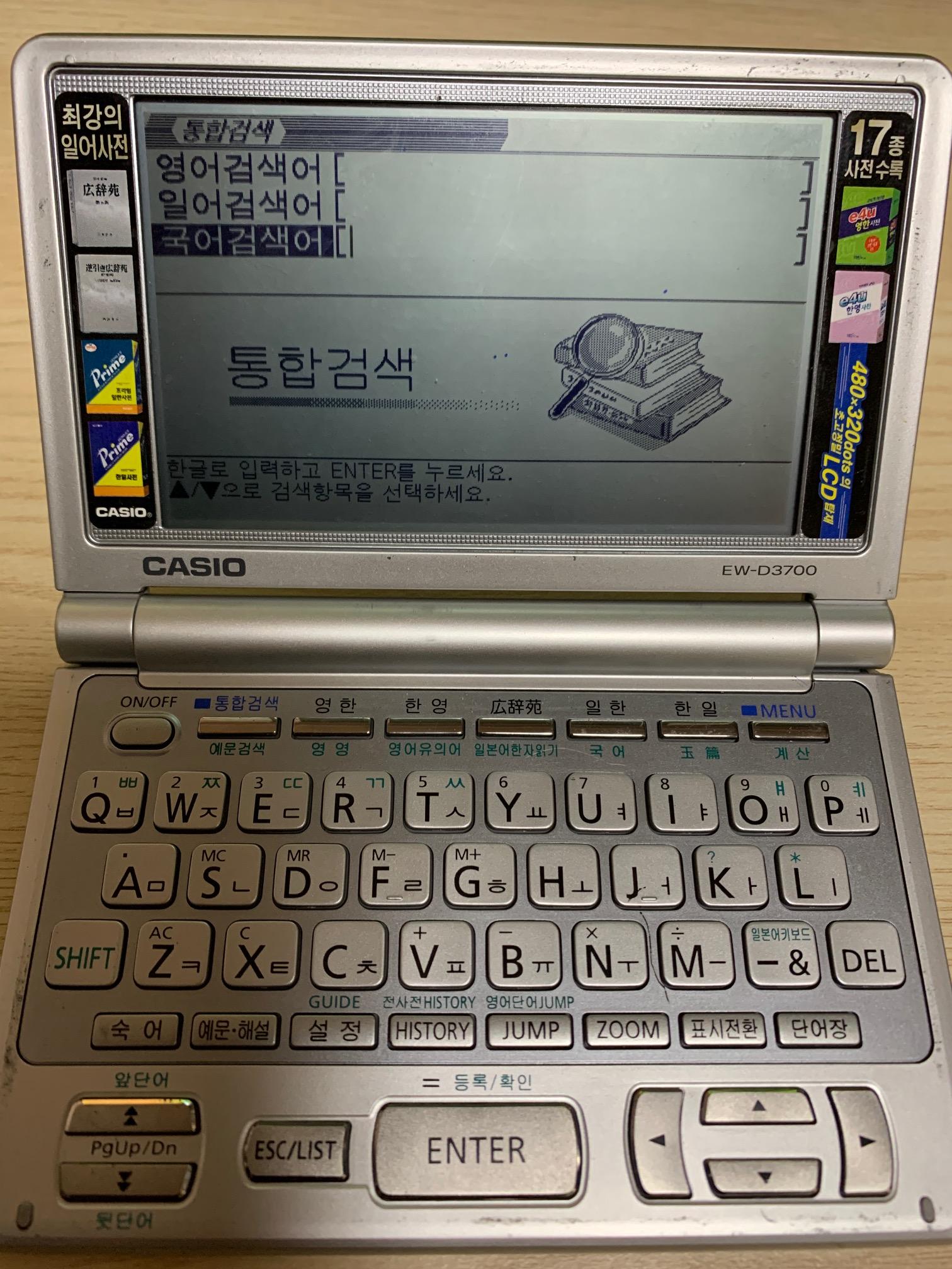 믿기 어렵겠지만, 아직도 일본은 전자사전을 만들고 있고 심지어 판매도 잘된다. 컬러 기능에 터치 기능, 필기 기능까지 넣어서 말이다. 아래는 내가 아주 오래전에 구입한 카시오 전자사전으로 모델명은 EW-D3700이다. 소리는 안나오고, 단순 흑백, 영어, 일어, 국어 검색이 가능한 기종이다. 예전에 영어 공부 좀 한다는 친구들은 대부분 전자 사전 하나씩은 가지고 다녔던 때가 있었다.