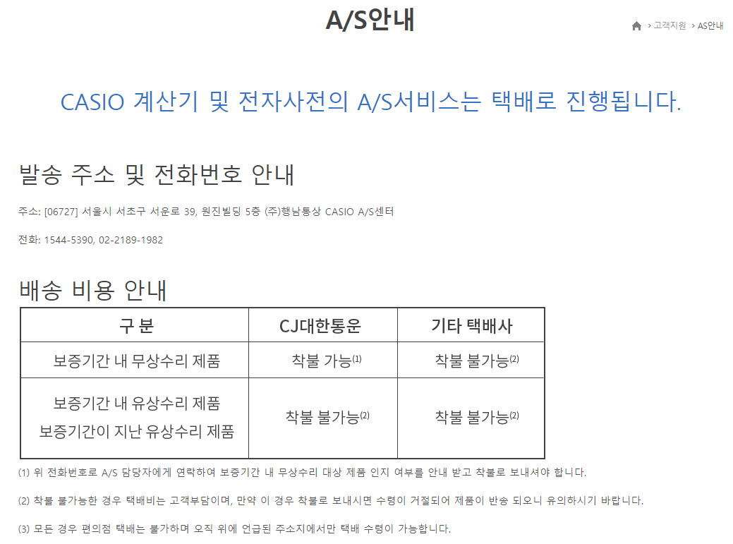 혹시나 하는 마음에 카시오 전자사전을 인터넷에 검색해보니 아래와 같이 행남통상이라는 곳에서 수리를 해주고 있었다. 너무나 오래된 모델이라서(즉 단종된 모델이라서), 수리가 가능한지 한번 알아보고자 전화를 했는데, 일단 보내달라는 말에 바로 보냈다.
