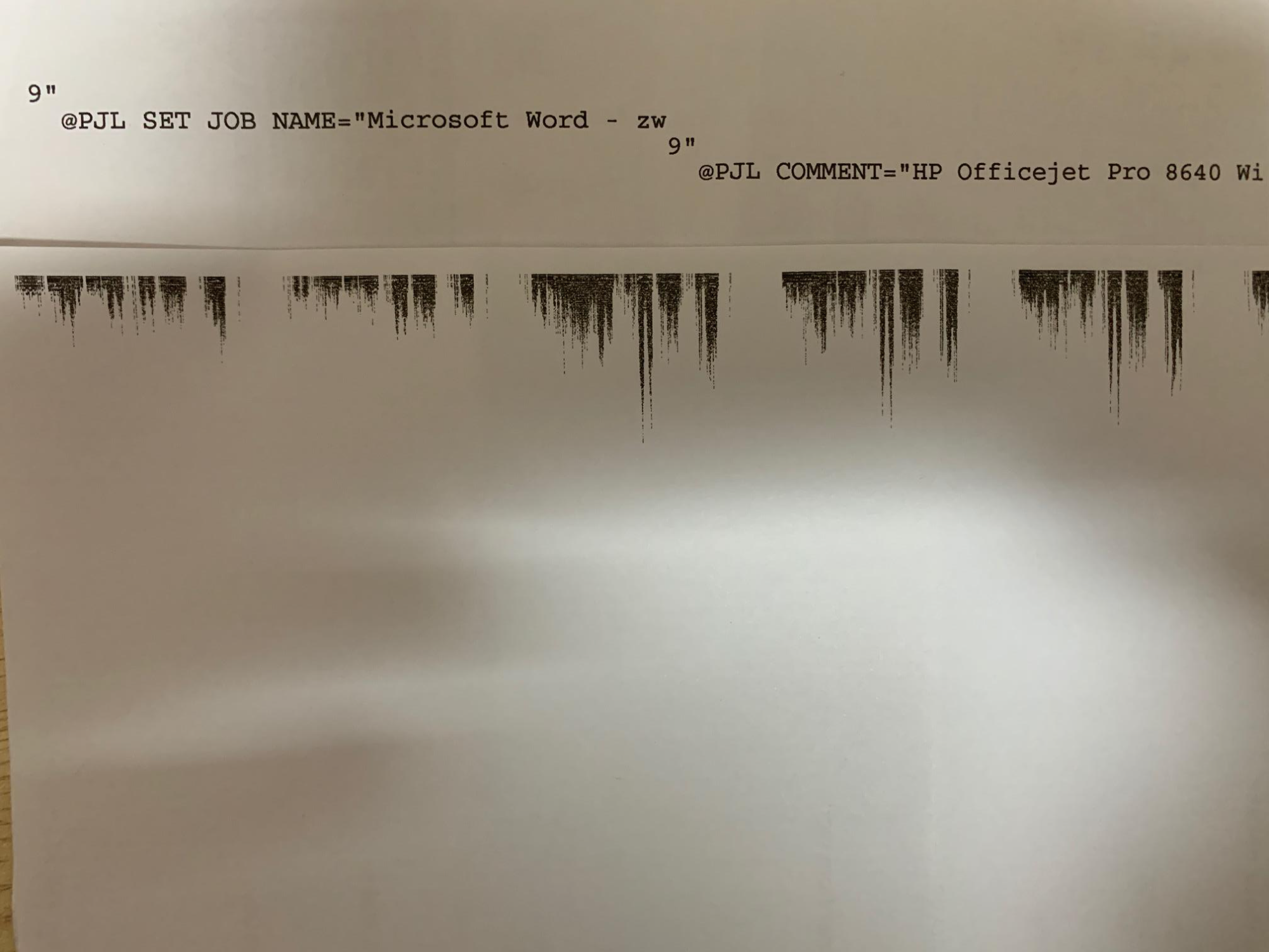 아니 이게 뭔소리?라고 할수도 있지만, 며칠전 정말 당황스러웠다. 구입한지 거의 6년은 다되어가는 HP 8640 프린터가 출력이 안되는것이다. 정확히 말하면 출력은 되는데 내가 원하는 파일이 출력이 되는게 아니라, 아래와 같이 3장이 나오면서 PJL SET JOB NAME = Microsoft word 문자 출력과 함께 크로마토크래피 같은 흔적의 기둥들을 남긴것이다.