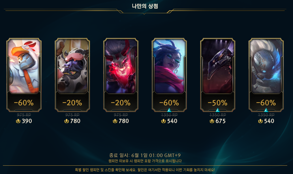 또다시 나만의 상점이 열렸다. 이번 나만의 상점 종료일은 6월1일 새벽1시로, 챔피언 미보유시에는 챔피언 포함가격으로 표시가 된다.
