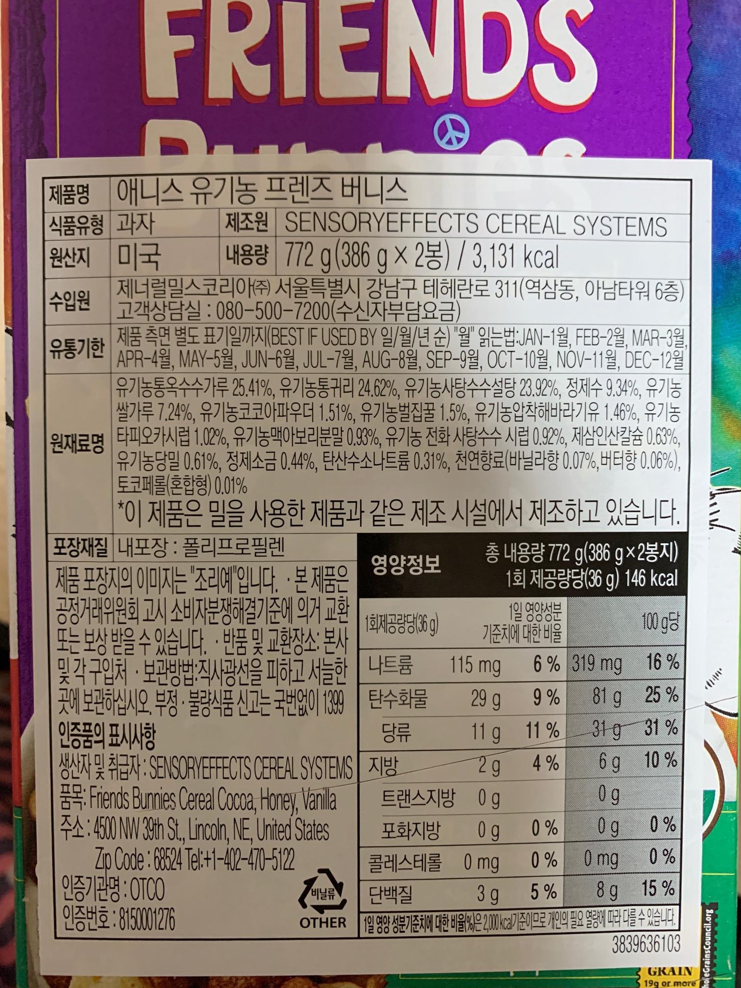 코스트코에 가면 항상 구입하는 제품목록중에 하나인, 애니스 유기농 프렌즈 버니스 시리얼이다. 이름은 뭔가 거창한데 포인트는 유기농이라는 것이다. 시리얼을 좋아하는 분들이라면 아주 강추한다.