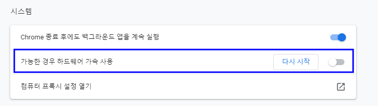 그리고 아래에서 가능한 경우 하드웨어 가속 사용을 체크해제하면 된다.