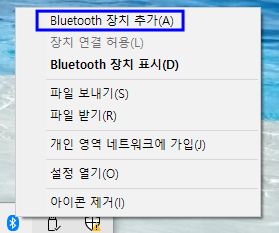 일단 내 노트북의 운영체제는 윈도우 10이다. 우측 하단을 보면 아래와 같이 블루투스 아이콘이 있는데, 우클릭을 하면 아래와 같이 장치 추가 버튼이 있다.