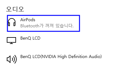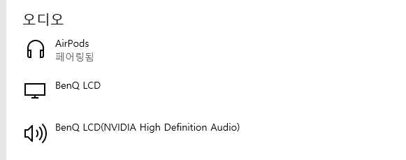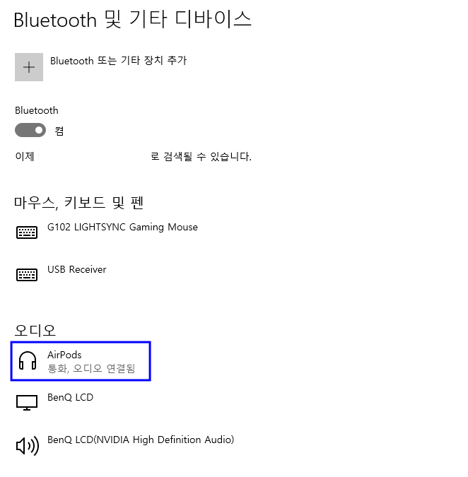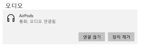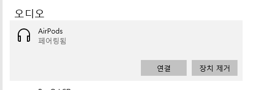 노트북 설정창을 보니 아래와 같이 에어팟을 사용 중일때는 연결됨으로 표시가 됐다.