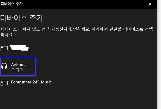 왜 그럴까싶어서 고민을 좀 하다가, 맨처음 에어팟을 사고 아이폰에 연결시킬때, 에어팟 케이스 후면의 동그란 버튼을 오래 누르고 있었던 기억이 났다. 그래서 후면 버튼을 한 5초 정도 누르고 있었더니 드디어 노트북에서 에어팟을 추가 장치로 검색하기 시작했다.