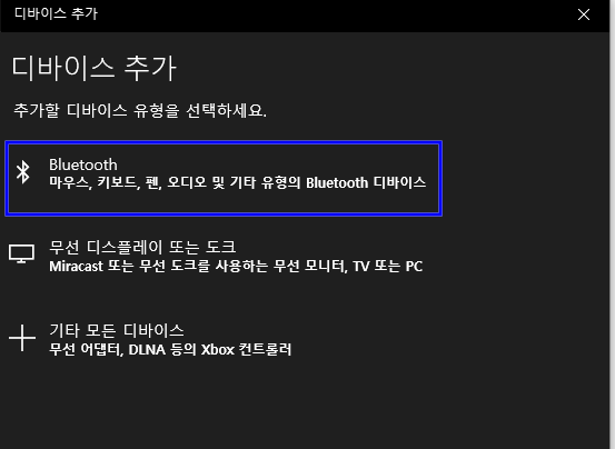 위의 버튼을 누르면 아래와 같이 어떤 유형의 블루투스 장비를 추가할 것인지를 선택할 수 있고, 가장 위를 선택한다.