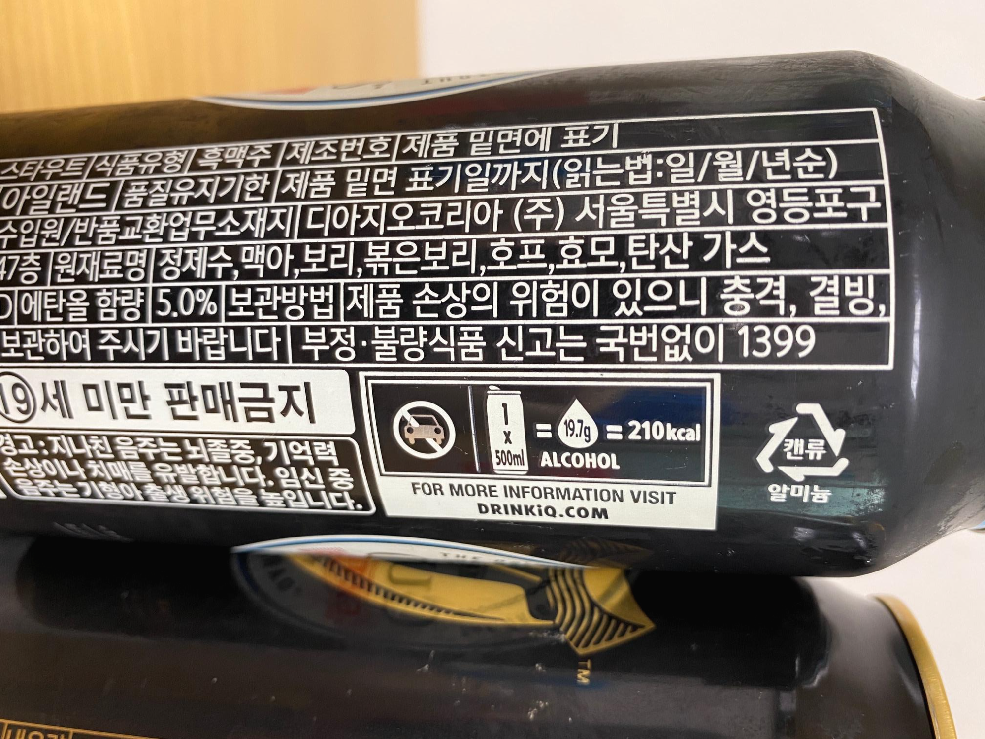 먼저 간단하게 원재료명을 살펴보자. 기네스 엑스트라 스타우트는 정제수, 맥아, 보리, 볶은 보리, 호프, 효모, 탄산 가스가 들어있고, 도수는 5도이다.