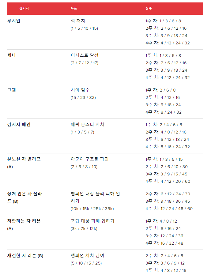이렇게까지 신경써서 하는 사람들이 있는지 모르겠지만, 감시자를 모집하는 도중에 3주 차부터 모집한 챔피언에 따라 특별한 목표를 완수하여 추가 점수를 획득할 수 있습니다. 이 목표는 특정 상황에 추가 점수를 제공하는 선택 사항입니다. 이 목표를 수행하지 않아도 모든 보상을 획득할 수 있습니다.