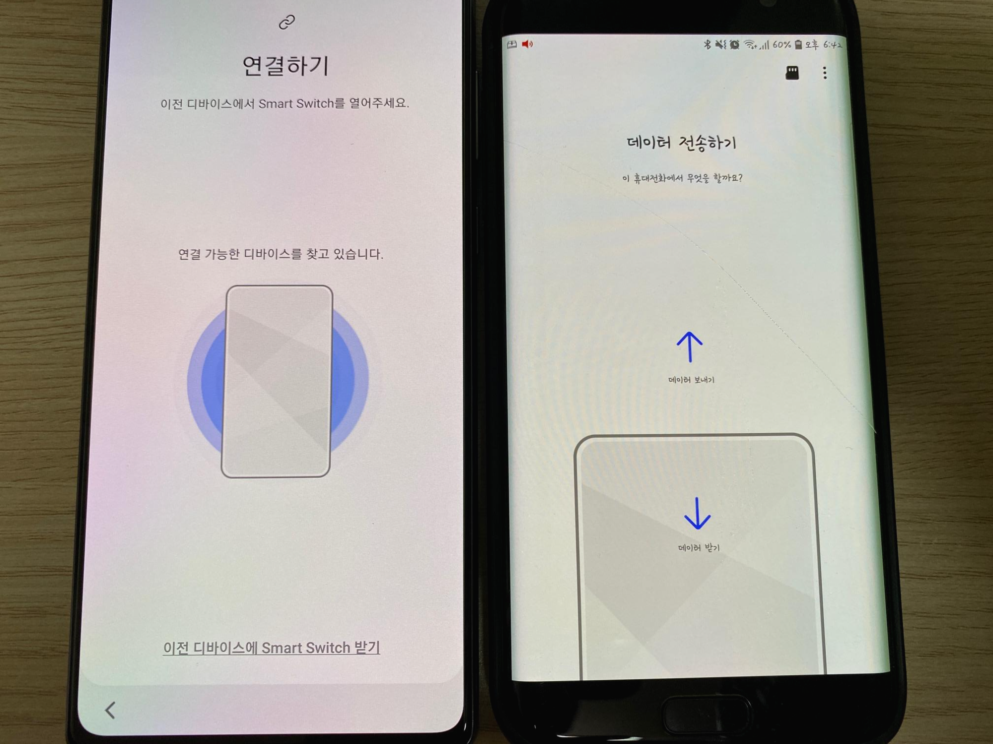와이파이를 통해 백업을 하려고 했더니 기존 갤럭시 S7 엣지에 스마트 스위치 어플이 설치되어 있지 않다고 알림이 나와서, 바로 설치해줬다. 이후 아래와 같이 기존폰에서 데이터를 보낼 것인지 받을 것인지 선택할 수 있게 나온다.