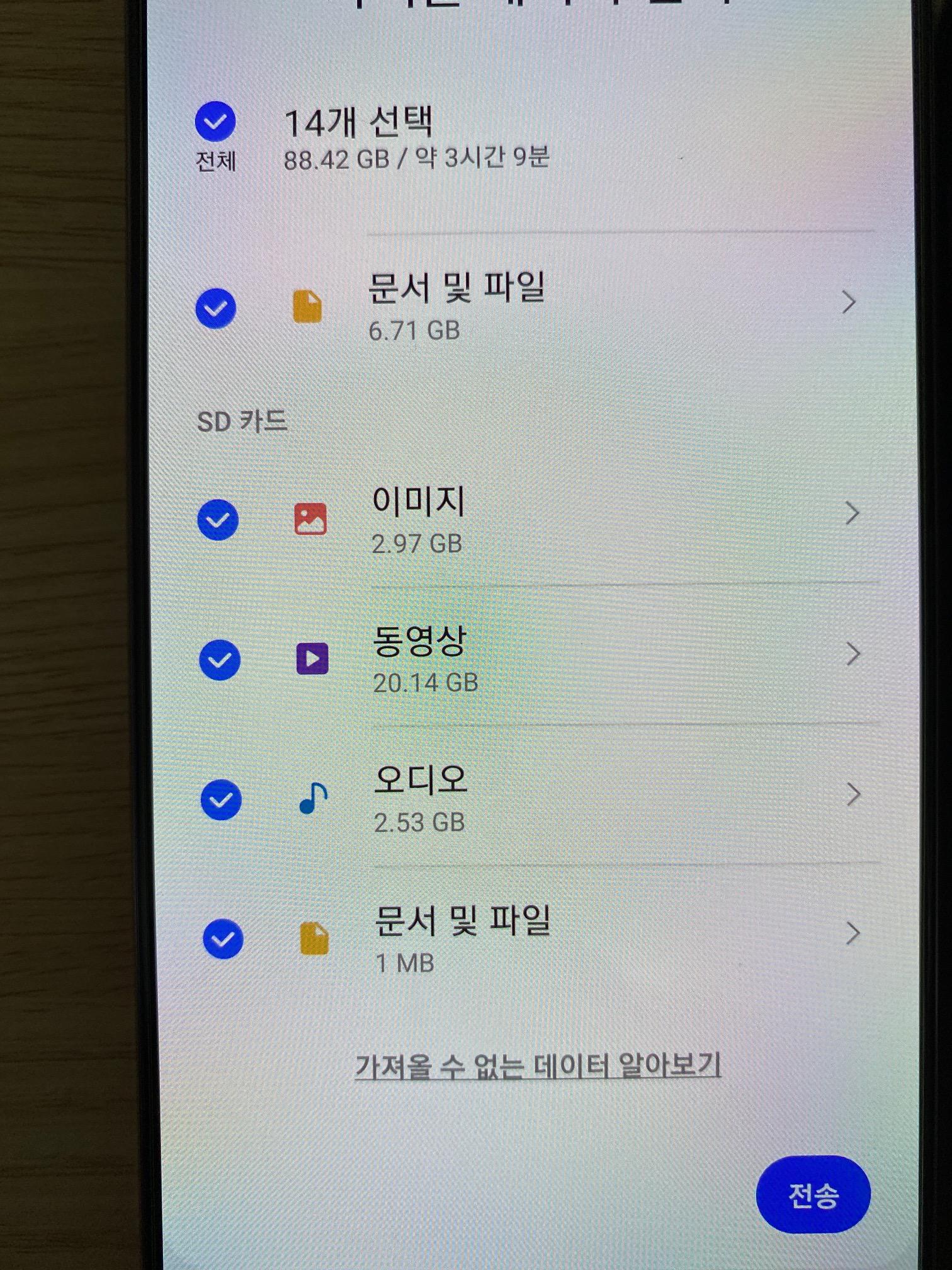 그럼 가져올 데이터를 확인하는데, 나는 기존 폰에 있던 데이터가 대략 80기가 정도 되었는데, 와이파이로 11시간 걸린다고 나왔고, 실제로 그 정도 시간이 걸린듯하다. 미리미리 기존 폰에 있던 동영상 정도는 삭제해서 용량을 줄여 놓는게 시간을 단축할 수 있는 길이다.