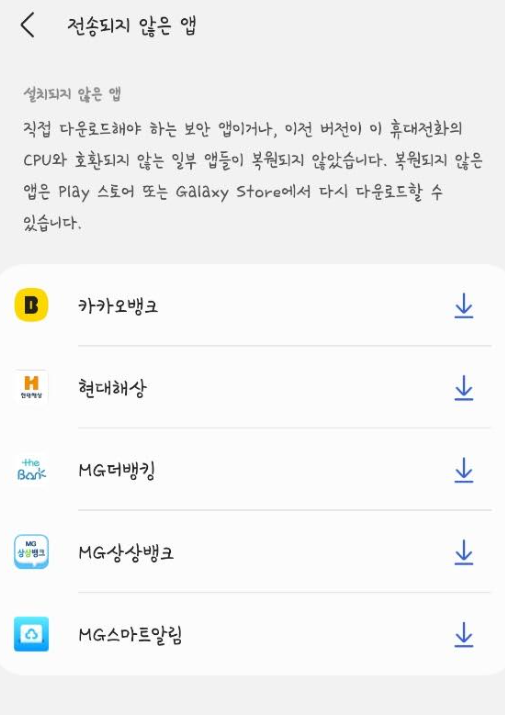 전송되지 않은 앱이라고 해서, 어떤 앱들이 재설치가 안됐는지 아래와 같이 꼼꼼히 알려준다.
