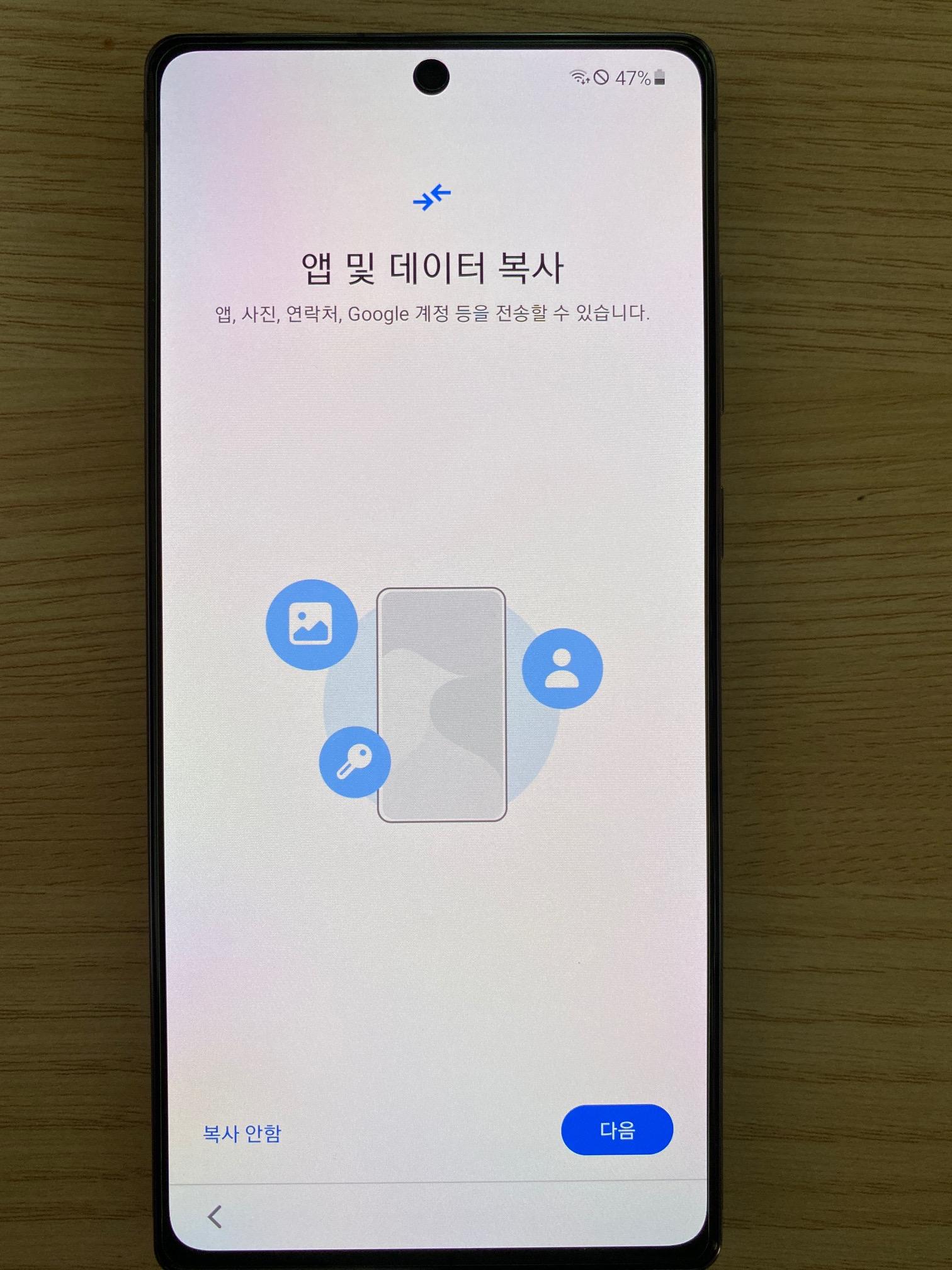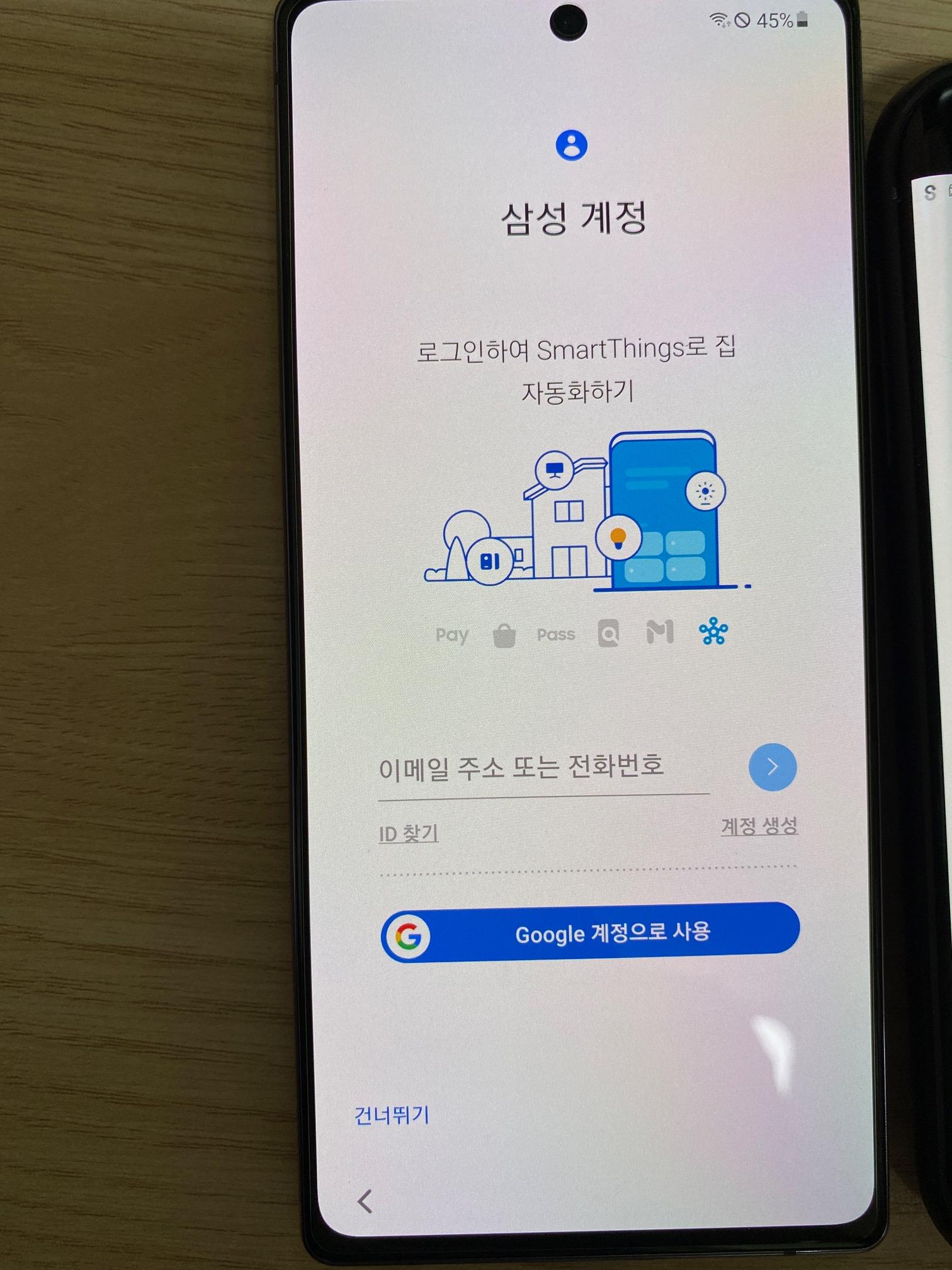계정 관련해서 쭉쭉 진행하면 된다. 그냥 안드로이드폰 새로 샀을때 또는 초기화 했을때 다시 세팅해주는 것과 동일한 절차들이 지나간다. 마무리가 되면 삼성 계정을 어떻게 할거냐고 물어보는데, 구글 계정으로 사용하기를 눌러도 되고, 직접 삼성 계정을 입력해도 된다.