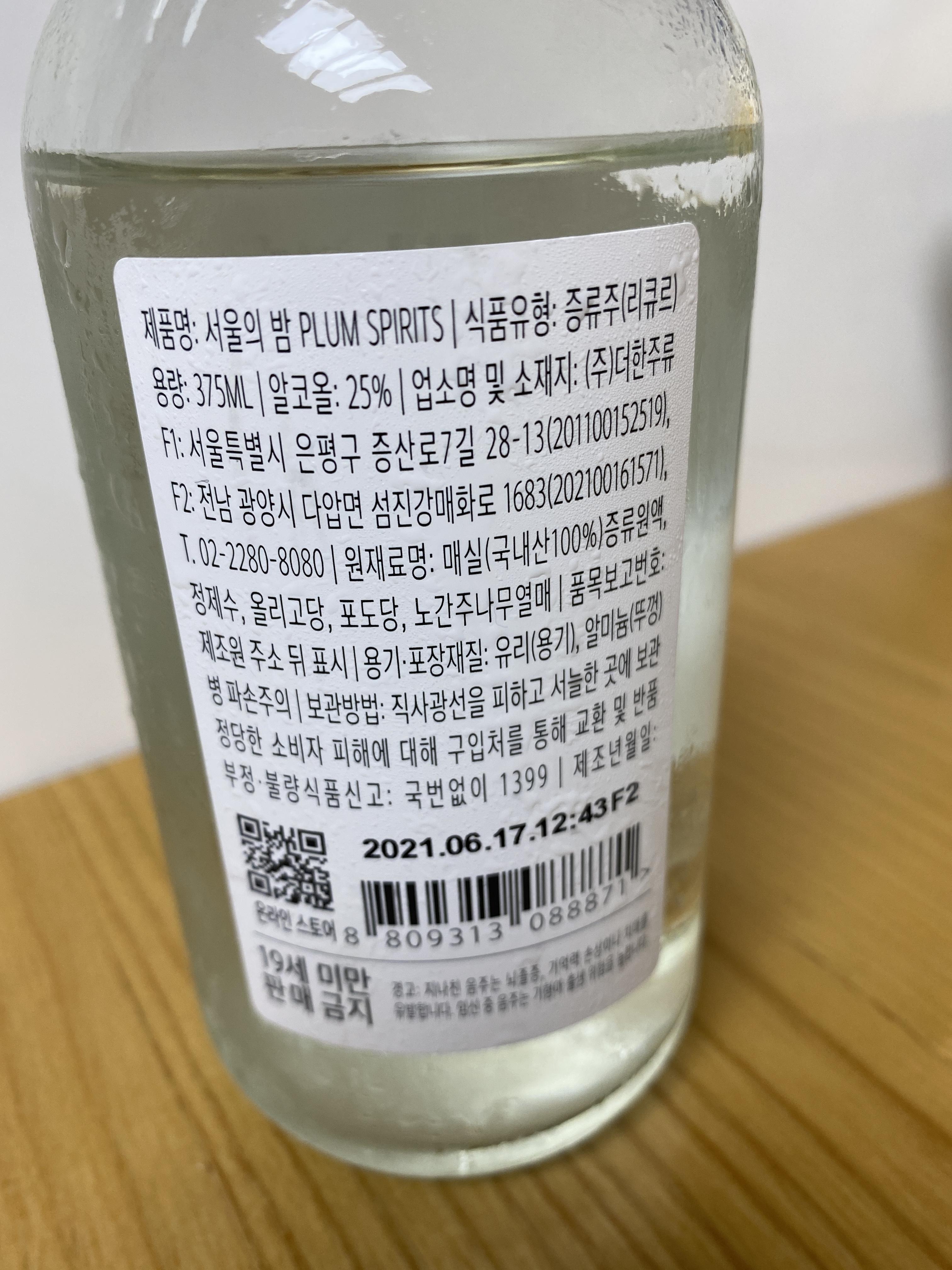 원재료명을 보자. 아. 매실 증류원액, 정제수, 올리고당, 포도당, 노간주나무열매를 사용했다고 한다. 도수는 25%수준.