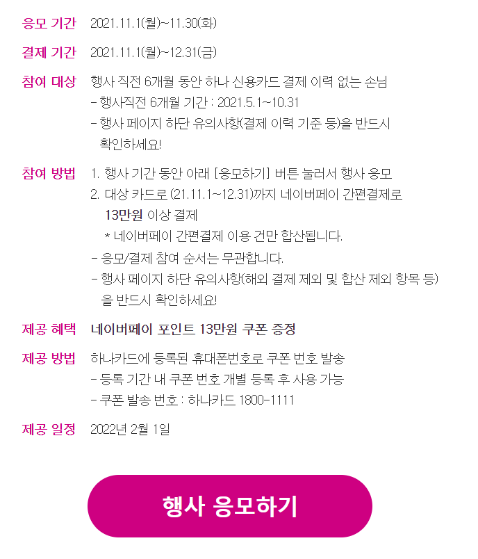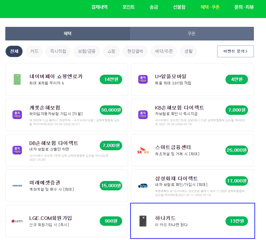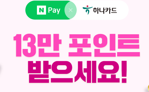 한 10만원 정도 결제할일이 있어서, 네이버페이의 혜택을 눌러보니 하나카드를 신규로 만들면 13만 포인트를 준다고 한다.