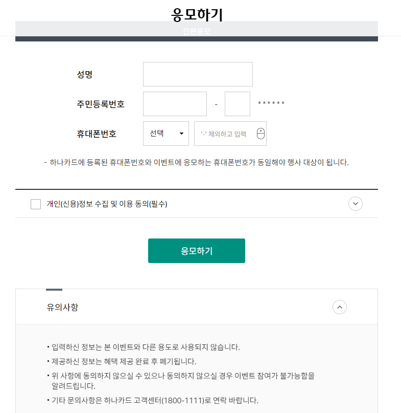 다행히 나는 이번이 첫번째 하나카드이다. 순서 상관 없다고 했으니, 정보를 입력하고 응모하기 버튼을 눌러보자.