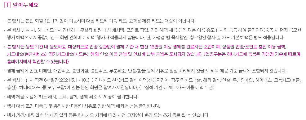3. 21년 5월 1일부터 10월 31일까지, 본인 이름으로 발급된 하나카드 신용카드 결제 이력 중 신용지킴이, 장단기카드대출, 해외 결제, 무승인 매입, 하이패스, 교통카드를 사용했으면 안되고, 다만 체크카드 이용 내역은 무관하다.