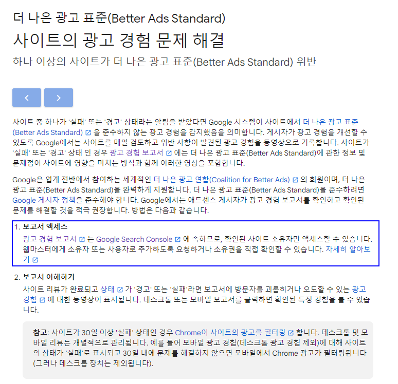 더 나은 광고 표준이라는 알림이 구글 애드센스에 지속적으로 보이면서, 도대체 이게 뭔가 싶어 확인 중이다. 아래와 같이 무슨 문제가 있는 지 확인하기 위해서는 광고 경험 보고서를 확인하라고 나오는데, 이것의 상위 개념이 구글 서치콘솔이다.