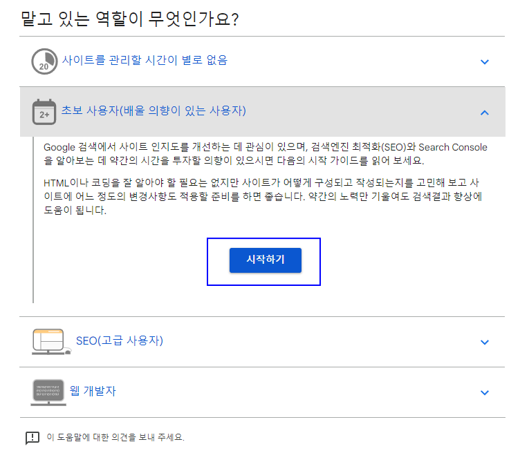 그럼 다시 아래와 같은 화면이 나온다. 나는 초보니까 초보 사용자를 선택 후 시작하기를 누르자.